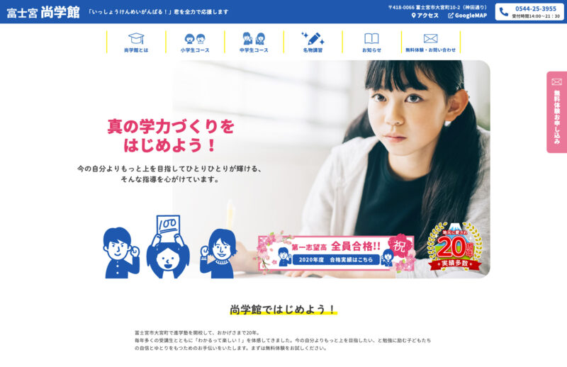 尚学館のWebサイトを開設しました。ご覧いただき、誠にありがとうございます。 今後とも、内容の充実を図るとともに、わかりやすく・最新の情報を発信してまいります。 また、Webサイトから無料体験の申し込みもできますのでお気軽にお問い合わせください。